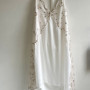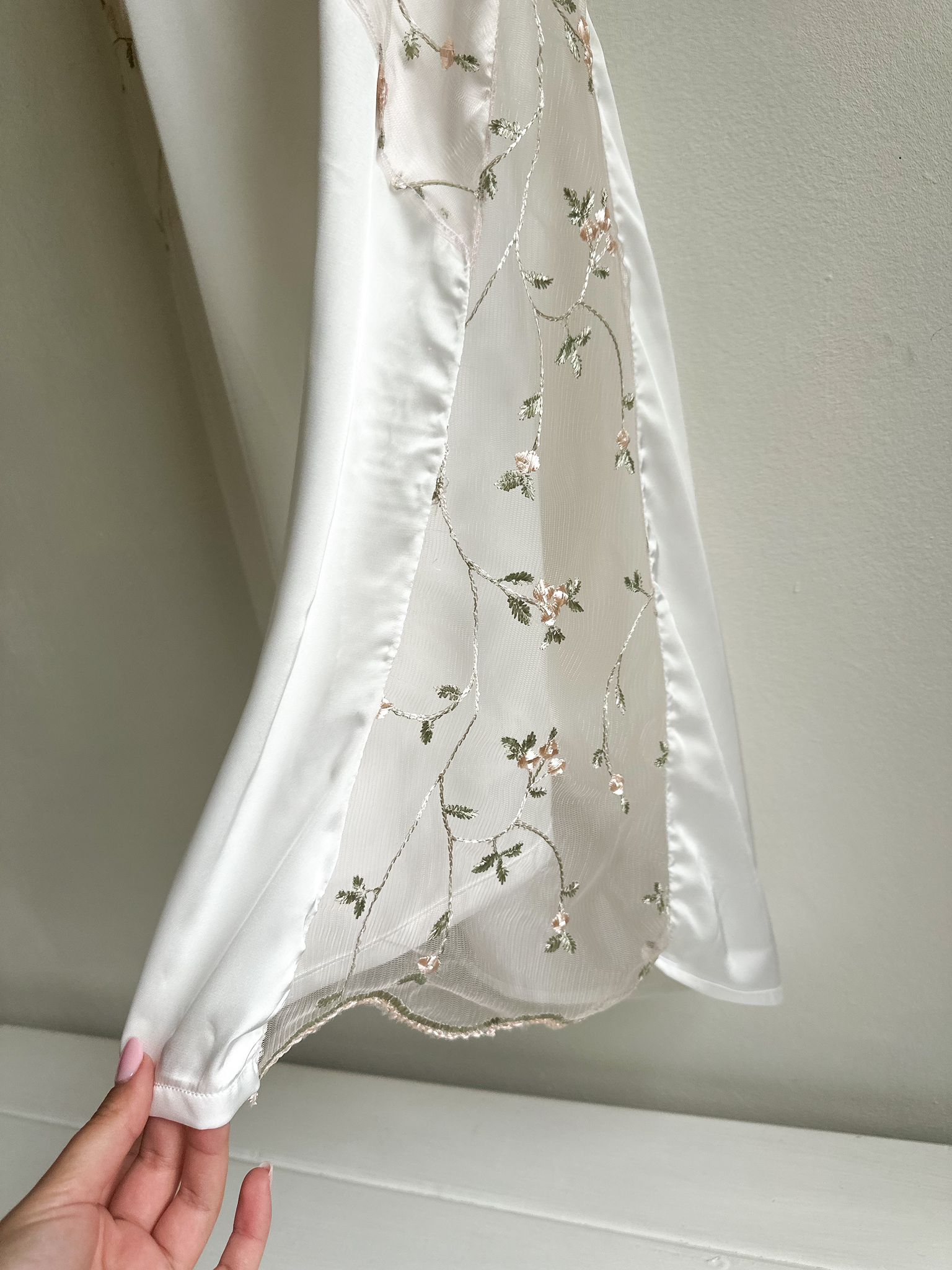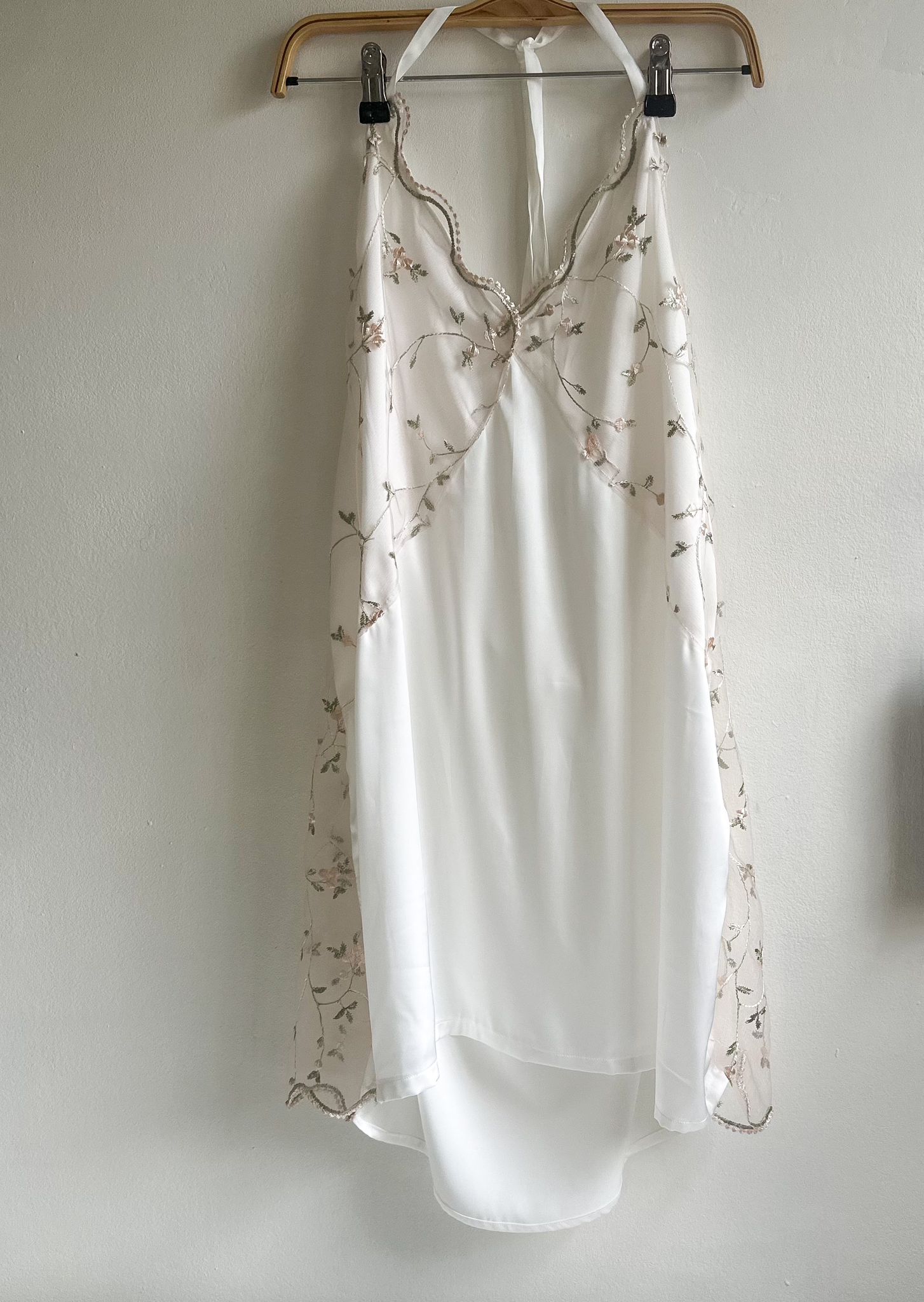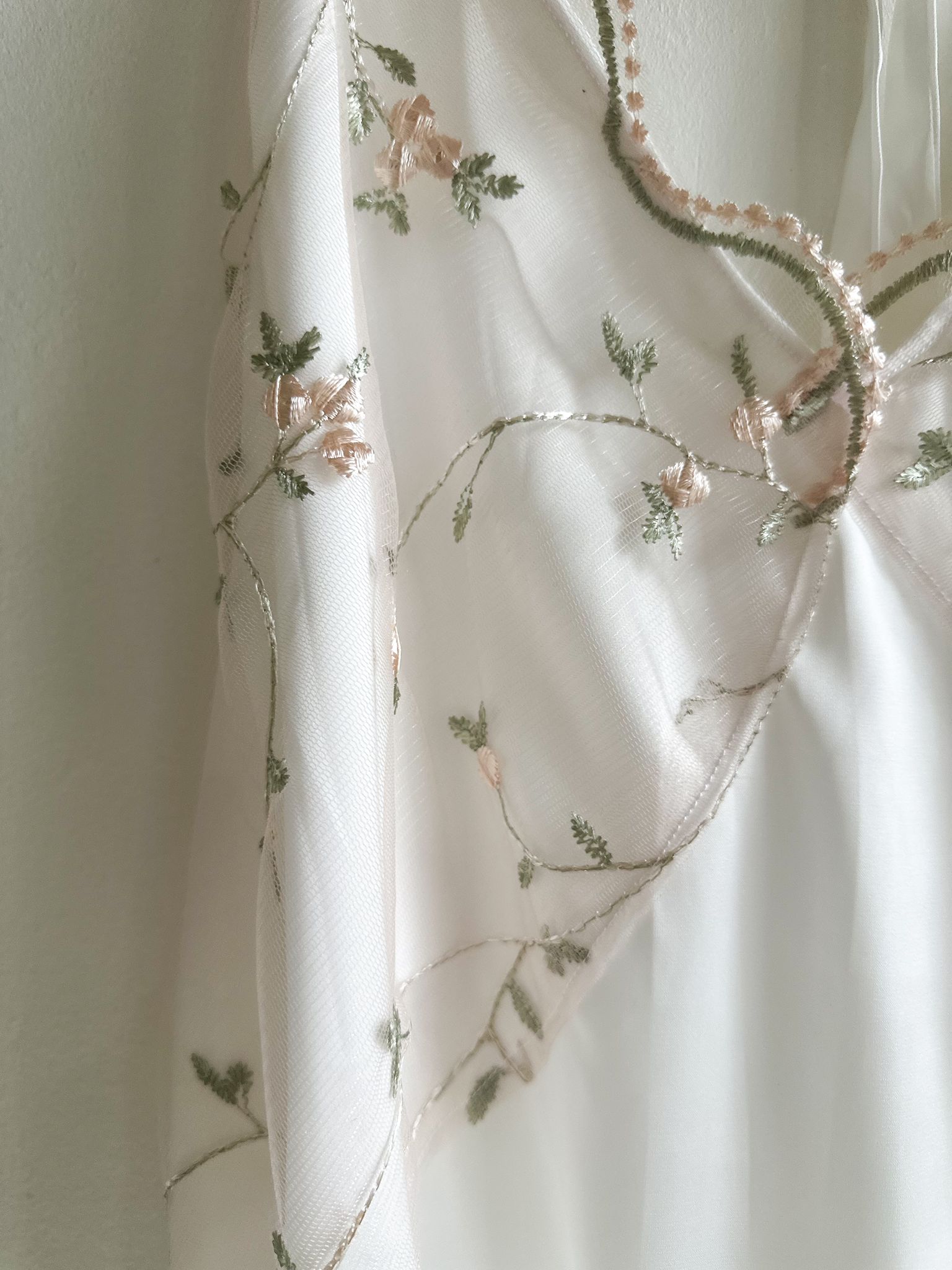 Seda de tul bordado, con lazo para ajustar, la prenda a la altura de escote que desees. Espalda descubierta con corte volado.